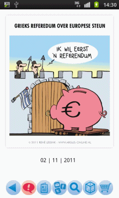 argus app nu beschikbaar 01/10/0010 tot voor kort was het alleen mogelijk om de dagelijkse argus cartoon te volgen als je achter je computer zit of met dagblad de pers in handen. dat is voor goed verleden tijd, want vanaf nu bekijk je de argus cartoon ook gewoon op je iphone. overal waar je wilt en wanneer je maar wilt! de argus app is gratis te downloaden. ga hiervoor naar de app-store en zoek op 'argus'. of klik op deze link, om direct naar de argus app gestuurd te worden. de argus app bevat de volgende funcionaliteiten: • dagelijkse cartoon • link naar het krantenartikel bij de cartoon • toegang tot het complete argus-archief • eenvoudig doorsturen van de cartoon • eenvoudig zoeken op trefwoord of datum • willekeurige cartoon uit het archief met één druk op de knop de argus app is exclusief voor argus-lezers ontwikkeld door nr47.org. ![]() | ||